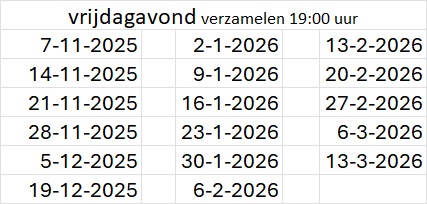 Vorig jaar speelden er 12 teams mee (dit jaar hopelijk nog meer) en waren de wedstrijden om de 14 dagen. Hierdoor kon het langduren voordat je kon spelen. Daarom is er dit jaar voor gekozen om op iedere vrijdag te spelen. En wel op de volgende dagen: