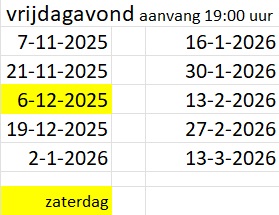 Aanwezig: 19:00 uur. Aanvang wedstrijden: 19:30 uur.