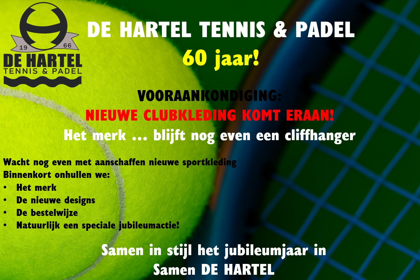 In dit jubileumjaar pakken we extra uit. Een compleet nieuwe lijn clubkleding! Het merk... blijft nog even een cliffhanger. Maar geloof ons: het wordt stijlvol, sportief en helemaal passend bij een 60-jarige De Hartel.
