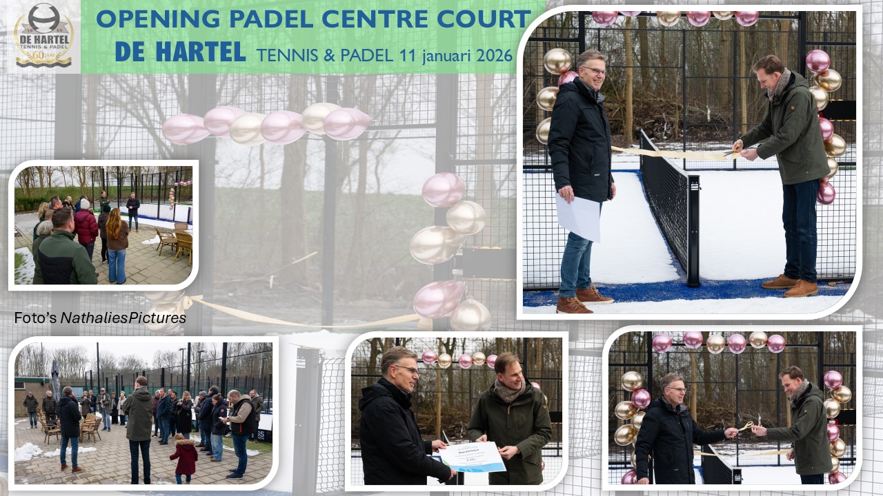 Zondag 11 januari iets na 14:30 uur vond de officiële opening plaats van onze nieuwe 4e padelbaan; genaamd Padel Centre Court. Met dank aan onze padelcommissie en de partners Tennisbouw/Padel Nederland, Minekus, IOB en de gemeente. Door betrokkenheid en goede samenwerking kunnen wij als club blijven groeien en investeren in de toekomst. Helaas kon door de weersomstandigheden de geplande demonstratiewedstrijd niet doorgaan. Mooi dat velen de moeite hadden genomen om de officiële opening bij te wonen, die feestelijk omkleed was. In aanwezigheid van de lokale media mocht De Hartel van de gemeente een cheque van €275 in ontvangst nemen. Het gouden lint werd doorgeknipt door wethouder van Sport Jeroen Postma. Hier nog wat sfeer impressies, met dank aan NathaliesPictures.