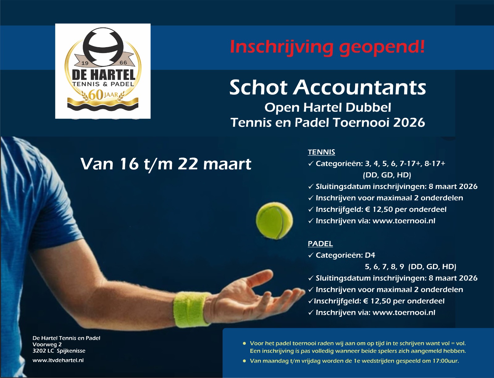 De inschrijving is inmiddels geopend en te vinden via: Schot Accountants Open Hartel Dubbel toernooi.