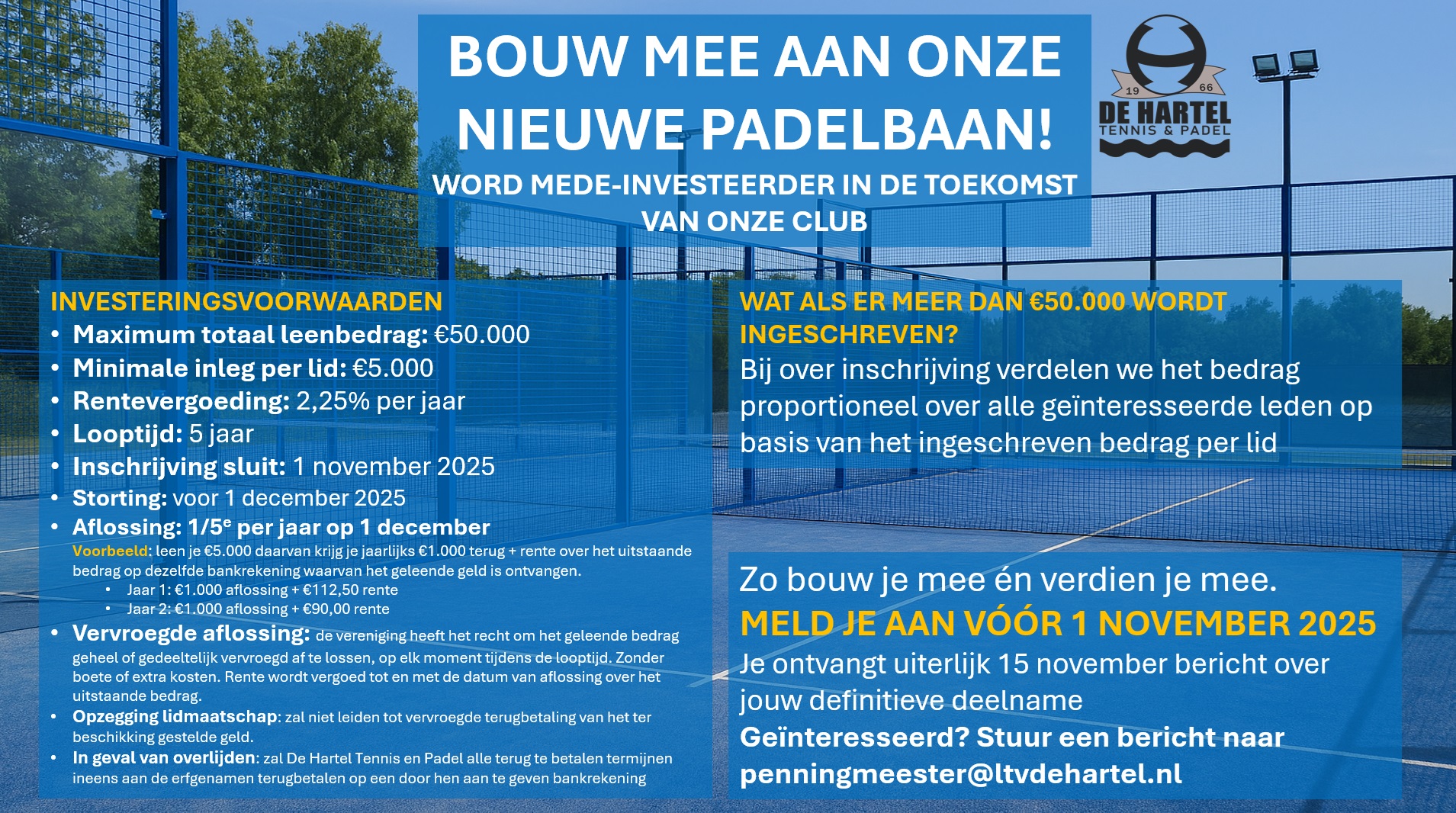 Heb je interesse om (een deel van) de aanleg van de padelbaan financieel te ondersteunen? Neem dan contact met ons op via [email protected].